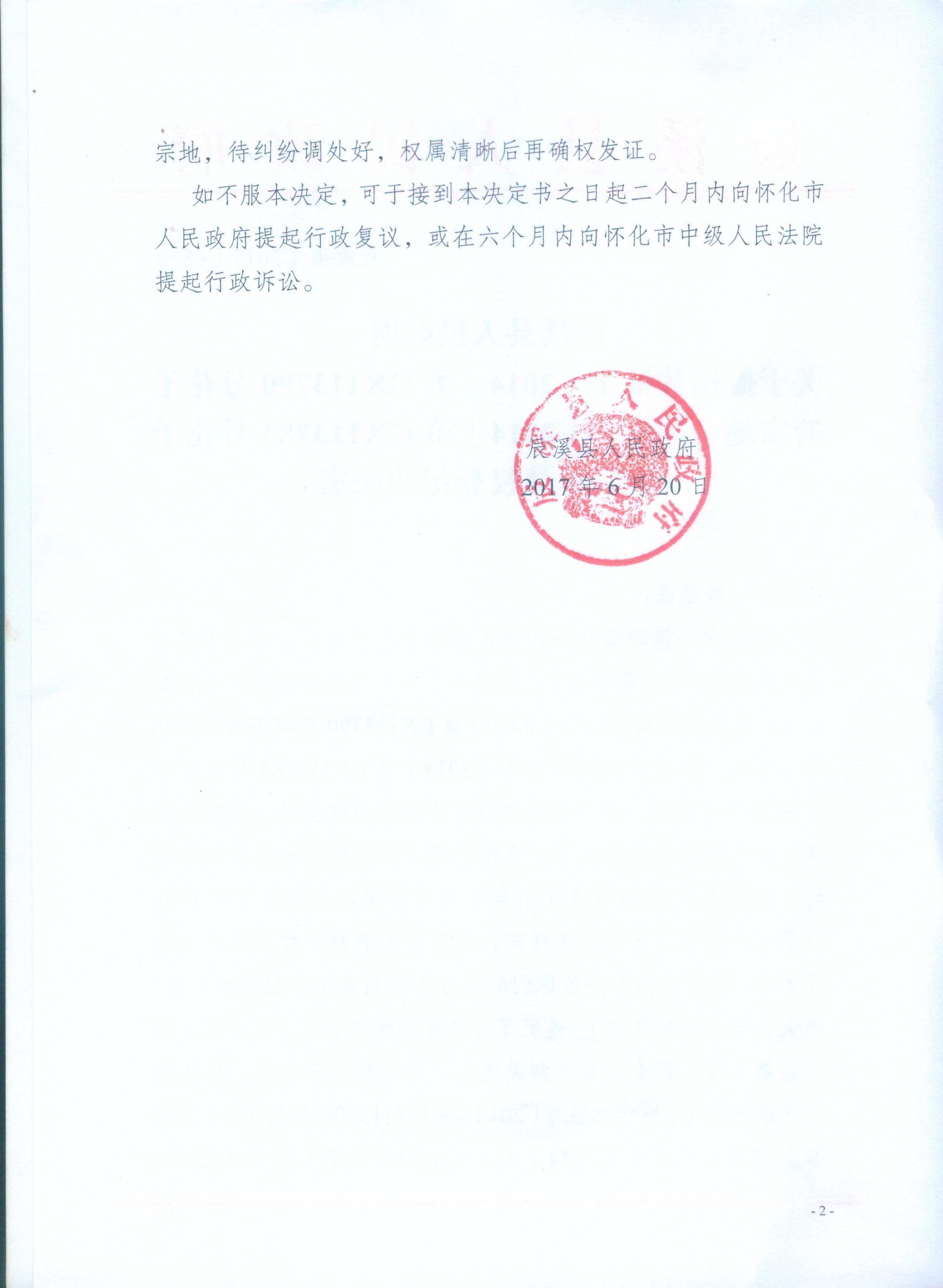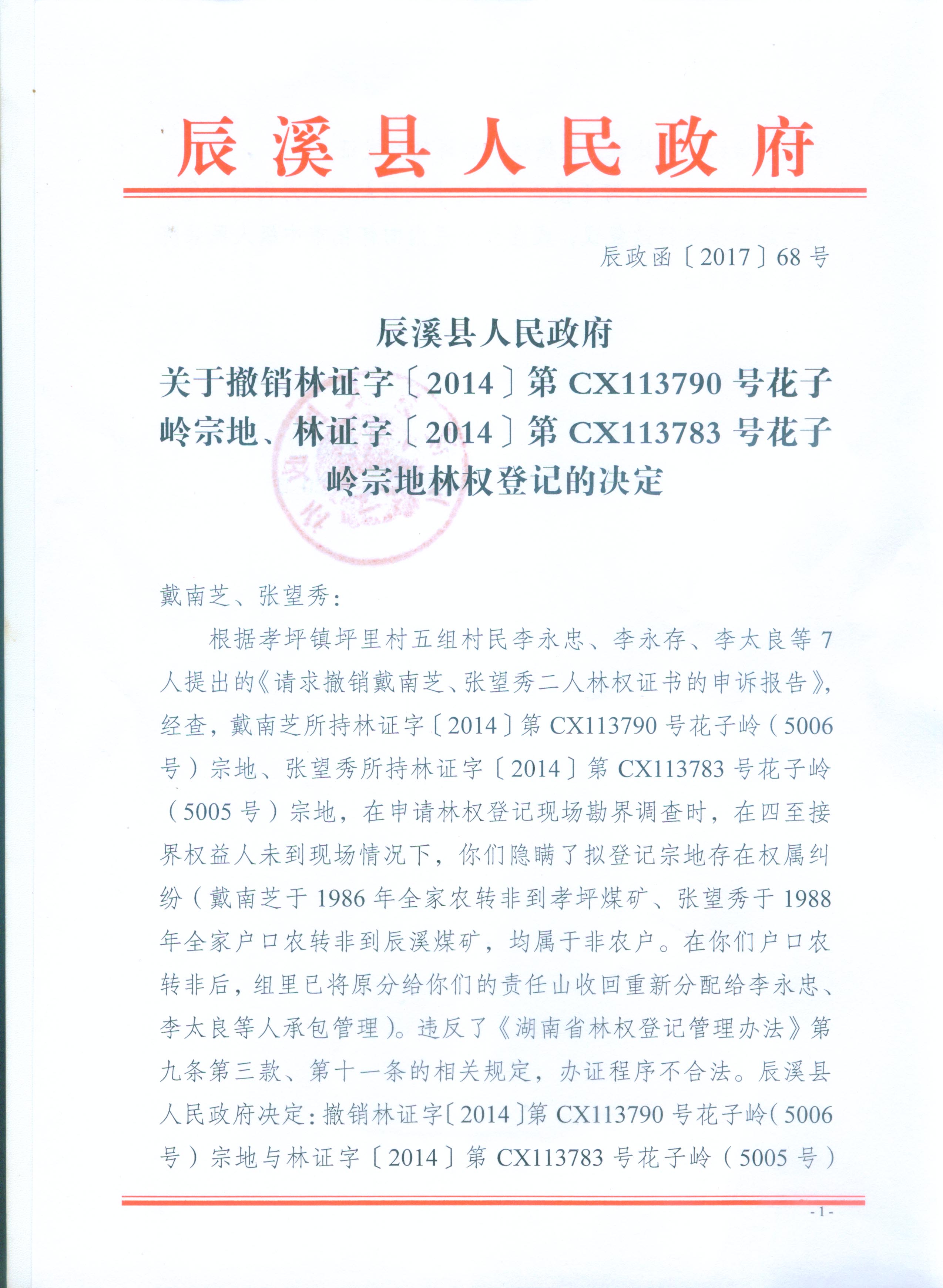 辰溪县人民政府关于撤销林证字〔2014〕第CX113790号花子岭宗地、林证字〔2014〕第CX113783号花子岭宗地林权登记的决定